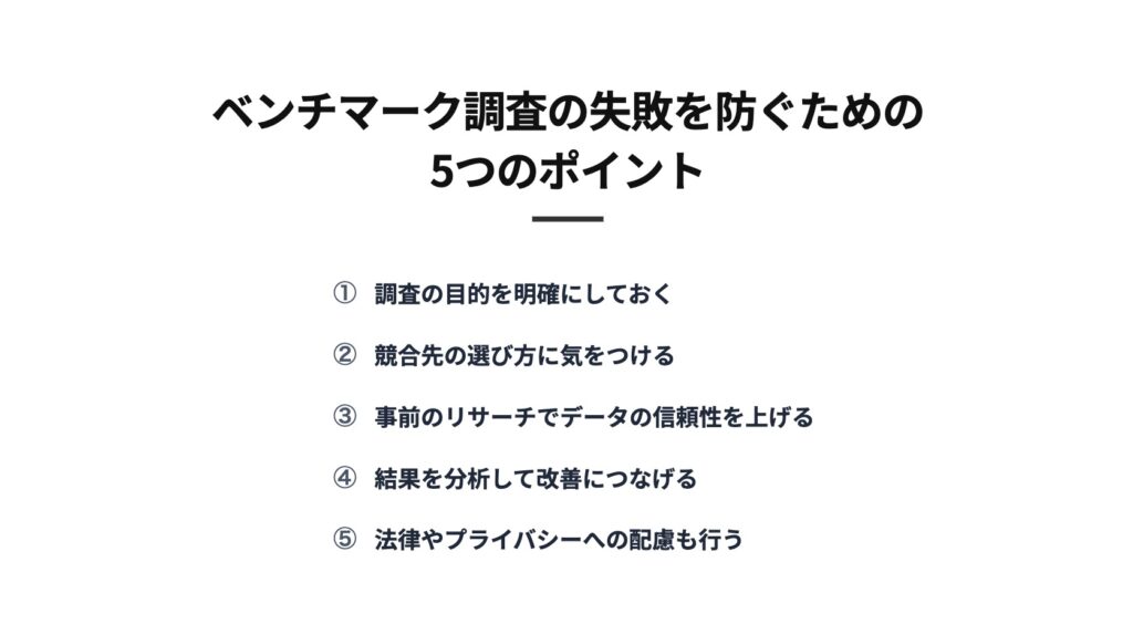 最後に、ベンチマーク調査をする際に重要なポイントをまとめました。ぜひ確認してみてください。