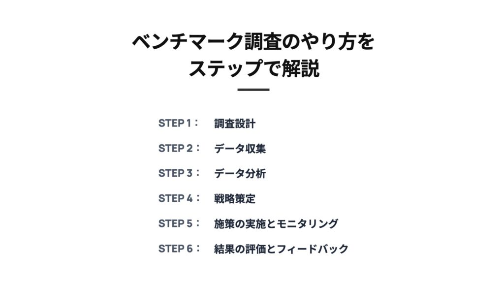 ベンチマーク調査は一般的に、「調査設計」「データ収集」「データ分析」「戦略策定」「施策の実施とモニタリング」「結果の評価とフィードバック」という流れで行われていきます。各ステップでどのようなことをしていくのかや注意したいポイントを見ていきましょう。