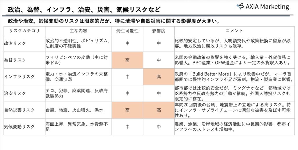 | 規制と規格の分析 | 進出国の法規制の把握製品安全基準の把握輸入規制の調査 | 現地の法令や規格に適合できるかどうかを事前に把握し、違反リスクや認可取得の障壁を特定します。 |