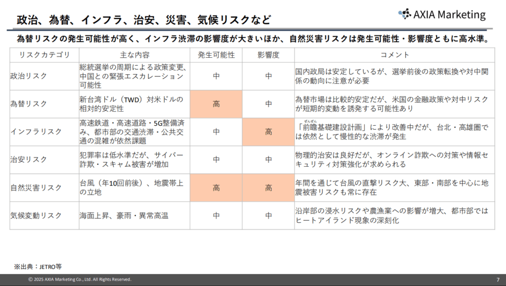 これらを把握せずに進出してしまうと、需要のない商品を投入してしまったり、現地の習慣に合わないマーケティングを行ってしまったりするリスクが高まります。