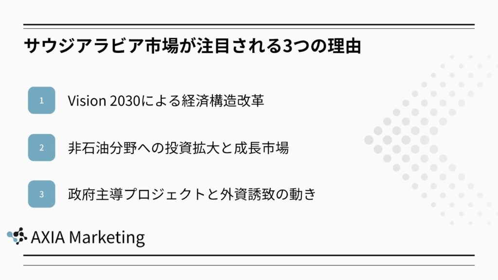サウジアラビア市場が注目される最大の理由は、国家戦略であるVision 2030による経済構造改革です。Vision 2030は、石油収入への依存を減らし、持続可能な経済成長を実現することを目的としています。