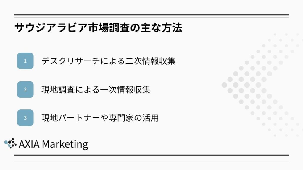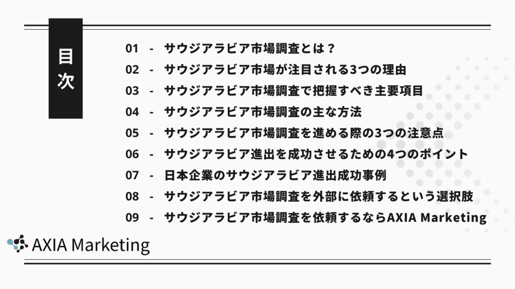 AXIA Marketing(アクシアマーケティング)株式会社では、デスクリサーチと現地調査を組み合わせた実践的な市場調査を通じて、仮説設計から戦略立案、進出判断までを一貫して支援しています。サウジアラビアへの進出や事業拡大を検討している企業は、確度の高い意思決定を行うためにも、専門知見をもつAXIA Marketing(アクシアマーケティング)株式会社への相談を検討してみてください。