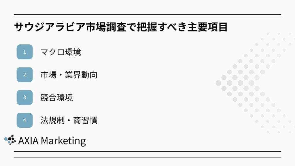 サウジアラビア市場調査の主な目的は、進出可否や事業戦略の妥当性を客観的に判断することです。市場規模や成長性といった定量データに加え、政府方針や投資制度、競合環境、現地ニーズを整理することで、自社がどの分野で競争力を発揮できるかを明確にします。