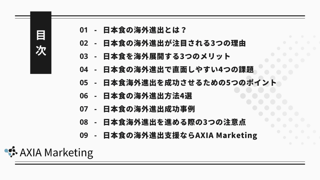AXIA Marketing(アクシアマーケティング)株式会社では、日本食ビジネスにおける海外進出を、調査・戦略設計から現地パートナー連携、実行支援まで一貫してサポートします。短期的なブームに左右されない、持続可能な海外展開を目指す企業にとって、信頼できる伴走型の支援が強みです。