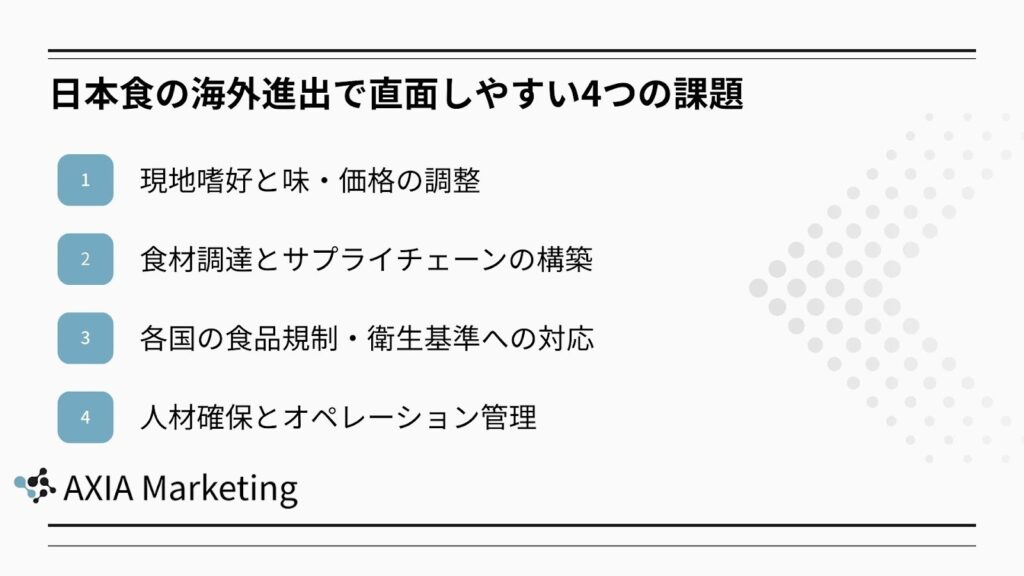 ここでは、日本食の海外進出において特に課題となりやすい4つのポイントを紹介します。