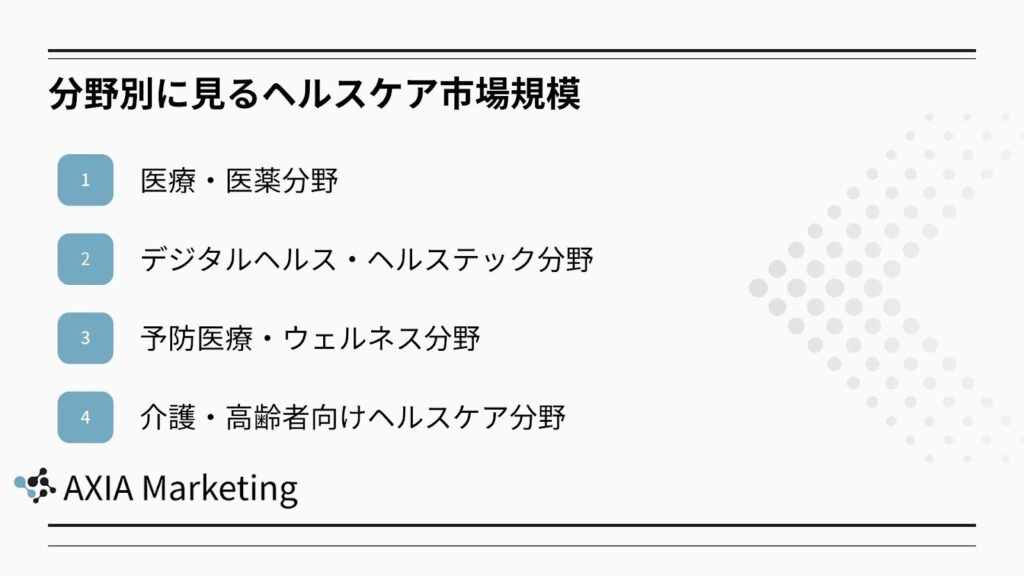 ヘルスケア市場は一枚岩ではなく、医療・医薬からデジタル領域、予防・介護分野まで多様な領域で構成されています。それぞれの分野で市場規模や成長要因は異なり、今後の事業機会を見極めるには分野別の動向把握が欠かせません。