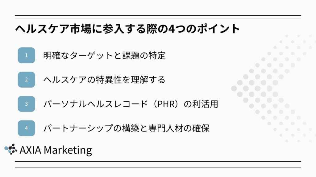 ここでは、ヘルスケア市場に参入する際に押さえておくべき重要な4つのポイントを紹介します。