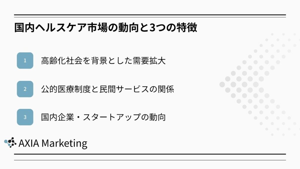 国内ヘルスケア市場は、人口動態や制度環境の影響を強く受けながら独自の進化を続けています。ここでは、日本市場を理解するうえで重要な3つの特徴を解説します。