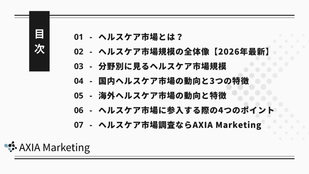 AXIA Marketing(アクシアマーケティング)株式会社では、国内外のヘルスケア市場に関する調査設計から分析、戦略活用までを一貫して支援しています。将来性の高いヘルスケア領域で、確かな意思決定につなげたい企業は、専門的な市場調査の活用を検討してみてください。