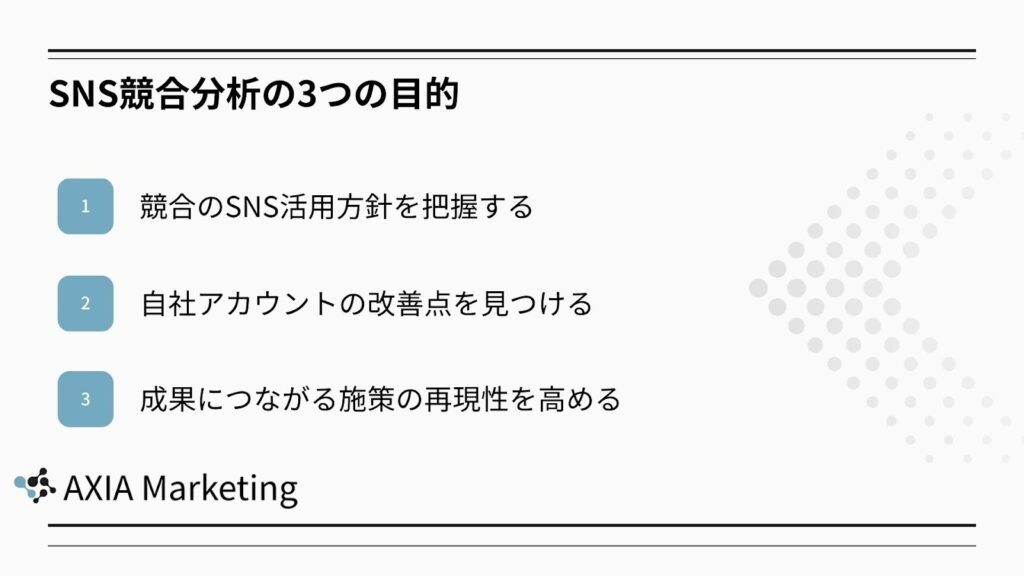 ここでは、SNS競合分析を行う主な目的を3つに整理し、それぞれがどのように成果向上につながるのかを解説します。