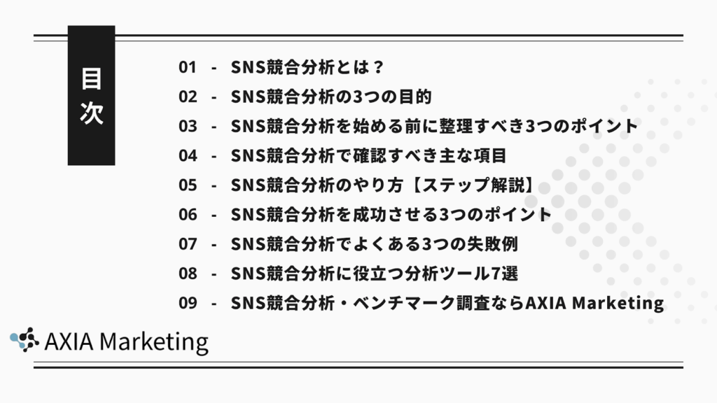AXIA Marketing(アクシアマーケティング)株式会社では、SNS競合分析からベンチマーク調査、戦略設計までを一貫して支援しています。各SNSの特性や業界特有の傾向を踏まえた分析設計により、再現性のある改善施策を導き出します。SNS運用を戦略的に強化したい企業は、専門的な競合分析の活用を検討してみてください。