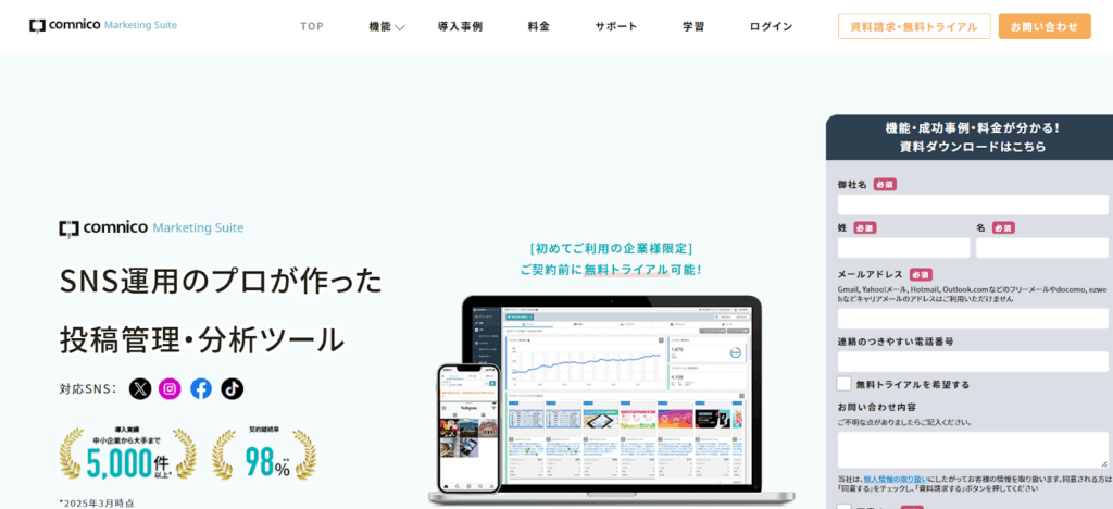 コムニコ マーケティングスイートは、SNS運用のプロが作った投稿管理・分析ツールです。投稿管理、コメント対応、レポート作成まで一元化できるため、運用効率の向上に寄与します。