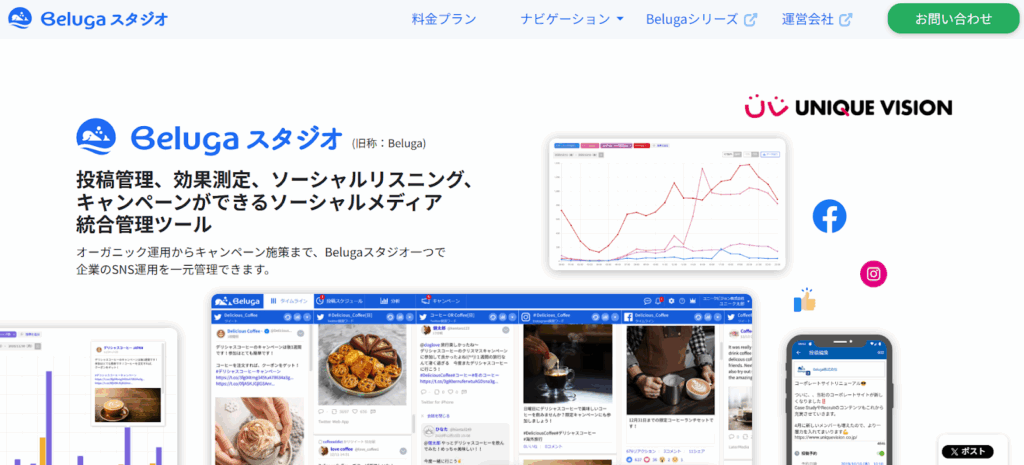 Beluga スタジオは、投稿管理、効果測定、ソーシャルリスニング、キャンペーンができるソーシャルメディア統合管理ツールです。投稿スケジュール管理や効果測定、レポーティング機能を通じて、チームでの運用体制を整えます。