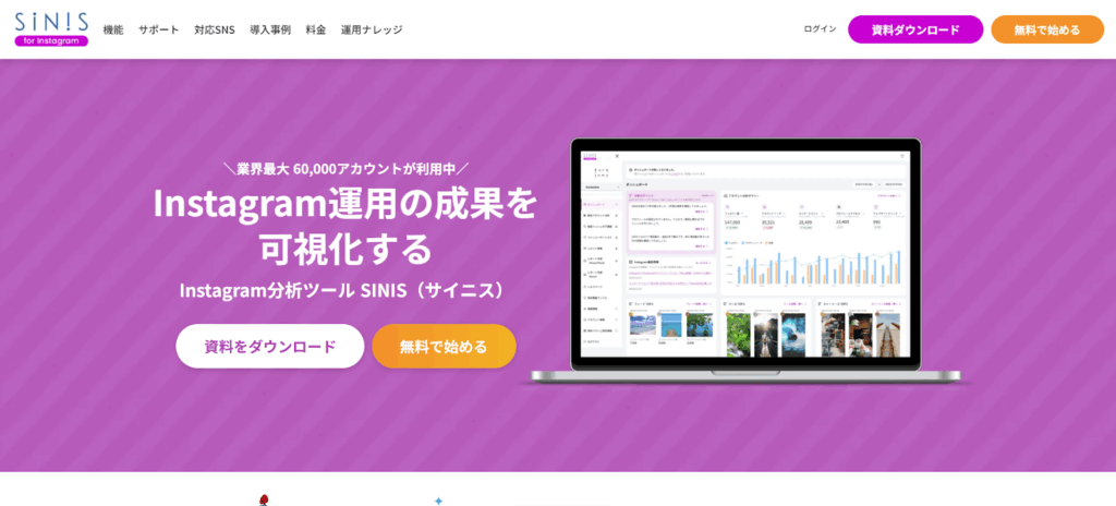 SINISは、Instagramアカウントの運用状況を詳細に分析できるツールです。フォロワー数の推移、投稿ごとのリーチ数や保存数、エンゲージメント率などを可視化し、改善ポイントを明確にします。