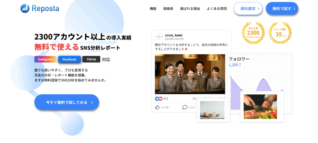 Repostaは、Instagramの投稿分析や競合比較を効率化するツールです。2,300アカウント以上の導入実績があり、無料で使えるSNS分析レポート機能を搭載しています。